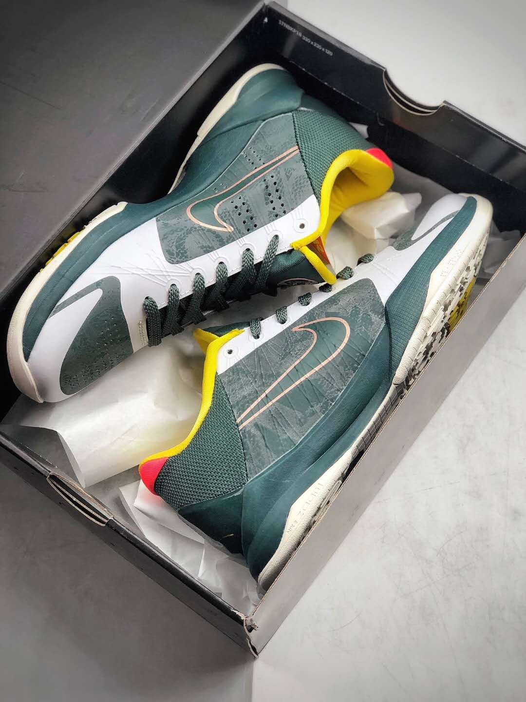 In conclusion, the Nike Zoom Kobe 5 Protro EYBL Forest Green Metallic Red Yellow CD4991-300 is a must-have for basketball enthusiasts and sneaker collectors alike. Combining style, performance, and a touch of exclusivity, this shoe is designed to elevate your game and make a bold statement on and off the court. Trust Nike to deliver the best, and experience the unmatched performance and style with the Zoom Kobe 5 Protro EYBL.